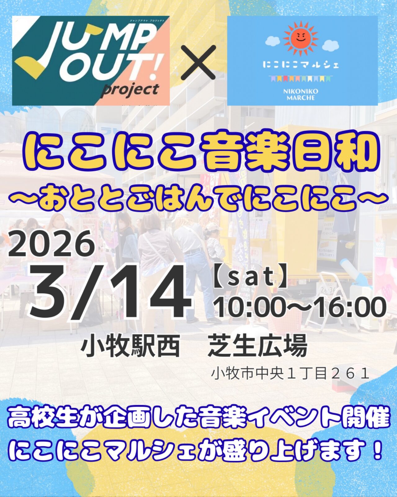 「にこにこ音楽日和」は、高校生等が自分の「やってみたい!」という気持ちを掘り起こし、地域や社会を舞台に実際にアクションを起こすことを大切にした社会参画プロジェクト「JUMP OUTプロジェクト」から生まれた企画と、毎月小牧市で定期開催されて親しまれている「にこにこマルシェ」がコラボして開催するイベント。